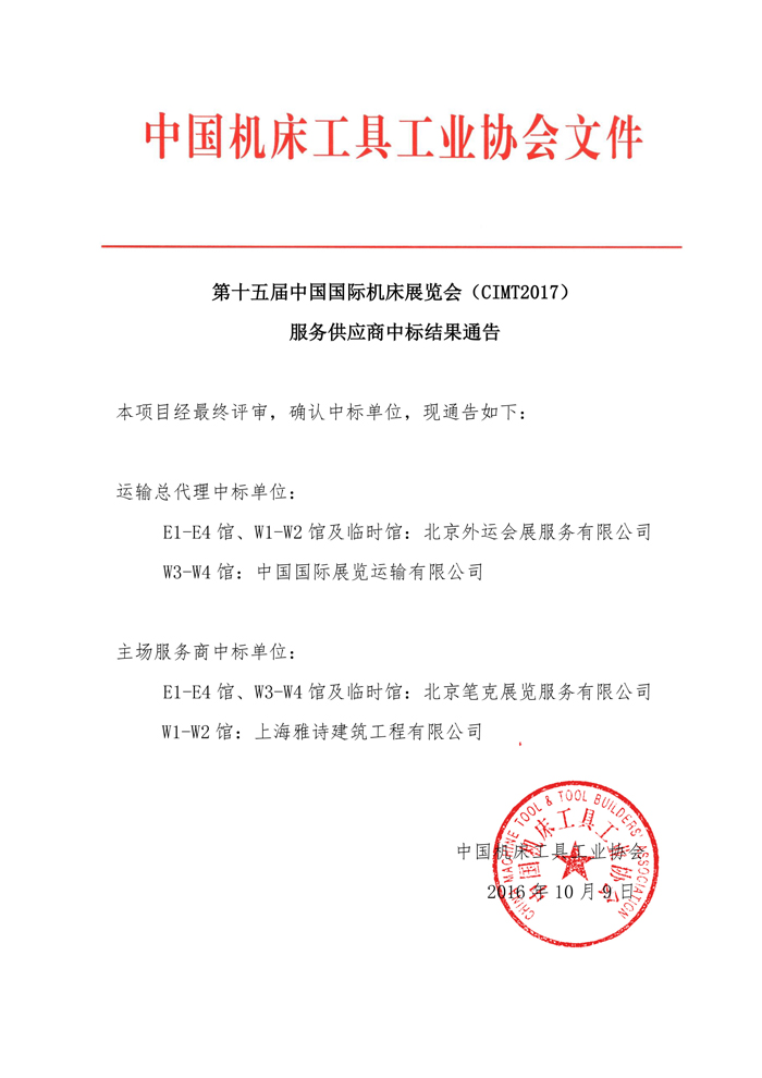 CIMT2017服務供應商中標結果通告