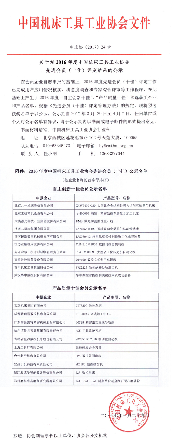 關于對2016年度中國機床工具工業協會先進會員(十佳)評定結果的公示