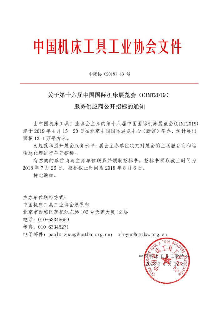 關于第十六屆中國國際機床展覽會(CIMT2019)服務供應商公開招標的通知
