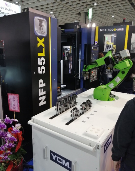 永進機械在本屆機床展上主要是展示智能制造解決方案,并以自動化、智能化和生產管理三項技術結合來靈活展示“智能工廠”的概念。首次發布NFX800B-MPS五軸智能柔性制造單元,主要針對復雜及高精度零件的加工需求,實現一次裝卡下完成全部加工的功能,適用于多個自由曲面零件或有軸向干涉的場合。NFX800B-MPS可以配置自動工作臺交換系統實現多工作臺的自動更換,并裝有i-Cube內置式智能傳感器,方便自動收集加工數據,進行大數據分析。NFX800B-MPS還參加了展會2019年機床研發創新競賽活動,展示鈦合金、鎳基合金和鋁合金航空葉輪加工試件,表面粗糙度0.05mm,輪廓精度0.01mm。