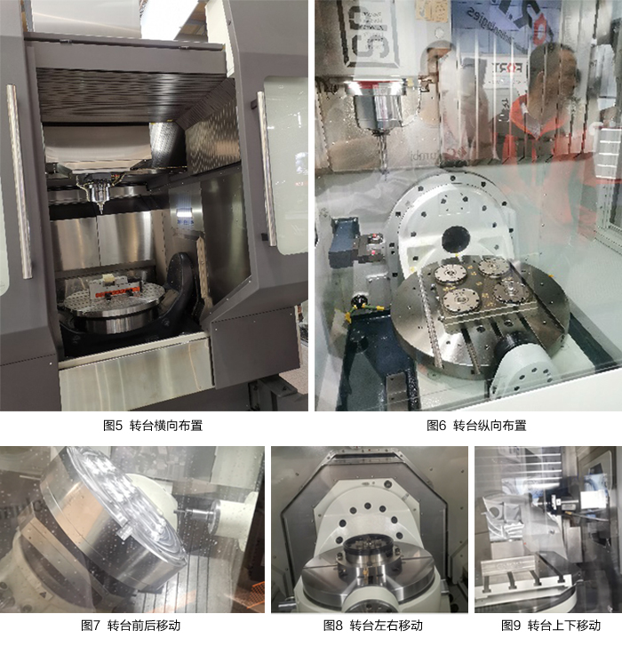 2. 機床展品以五軸為主,單機結構布局各顯神通,刀具和工件的運動方式各有千秋。以簡單的搖籃式五軸加工中心為例,搖籃雙擺轉臺布置方式有橫向的(圖5)、有縱向的(圖6),轉臺有固定的、有隨坐標前后移動的(圖7)、左右移動的(圖8)、上下移動的(圖9)。