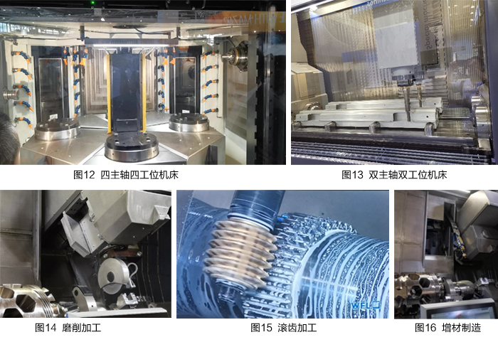 4. 單機加工效率普遍提升。主要體現在三個方面,其一是機床本身主軸和坐標的運行速度快,主軸轉速普遍都在20000r/min以上,很多機型坐標移動速度在60m/min以上,加速度0.8g以上,連以重切削見長的Mandelli、MCM等品牌機床的坐標快移速度也達到50m/min以上。其二是多主軸多工位加工(圖12、13),可同時加工多個零件,加工效率成倍數增長。其三是復合加工,以著名的車銑復合機床制造商WFL為例,這次展出的機床不僅融合了車、銑、鉆、鏜、磨、滾齒、插齒等這些減材加工功能(如圖14、15),還加入了激光3D打印增材制造功能(如圖16)。一臺機床一次裝夾幾乎能夠完成回轉體類復雜零件所有特征的加工。