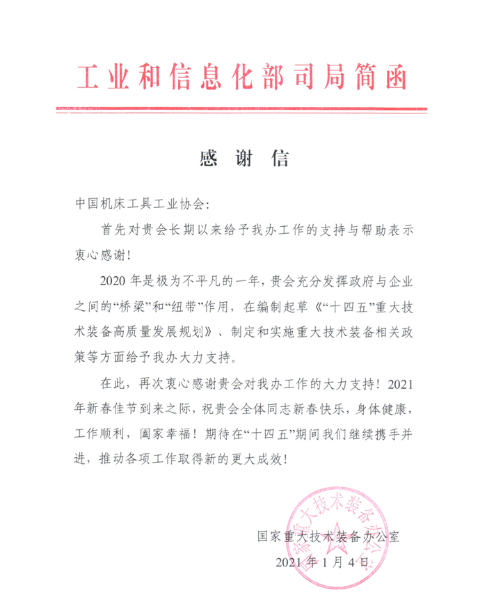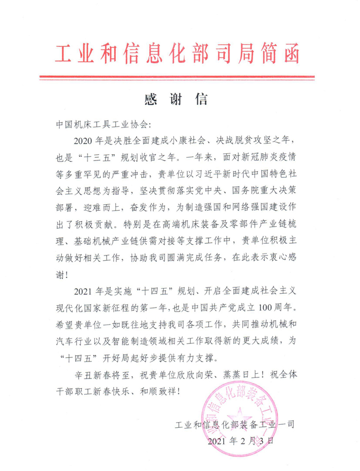 歲末年初,中國機床工具工業協會(以下簡稱“機床工具協會”)陸續收到國家工業和信息化部裝備工業一司、二司等政府部門發來的感謝信,信中充分肯定了機床工具協會在政府與企業之間發揮的“橋梁”和“紐帶”作用,堅決貫徹黨中央、國務院重大決策部署,迎難而上,奮發作為,為制造強國和網絡強國建設做出了積極貢獻!
