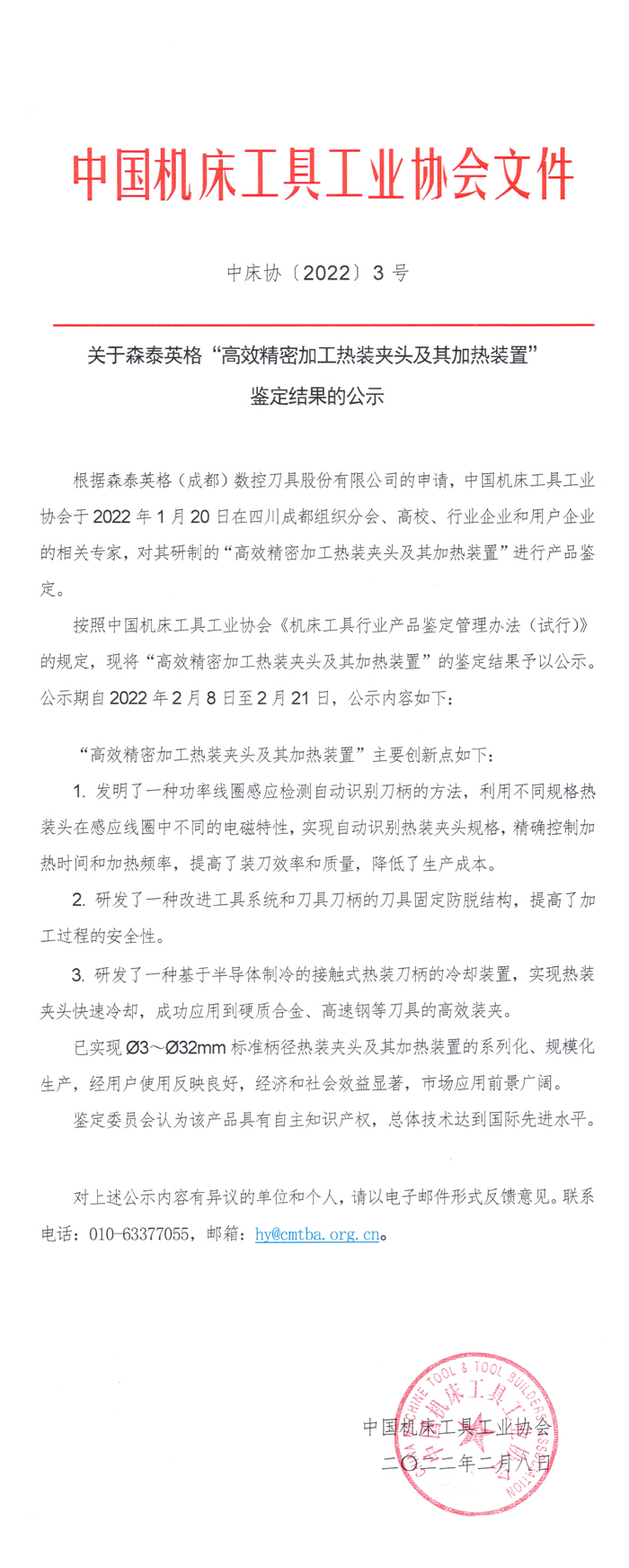 關于森泰英格“高效精密加工熱裝夾頭及其加熱裝置”鑒定結果的公示
