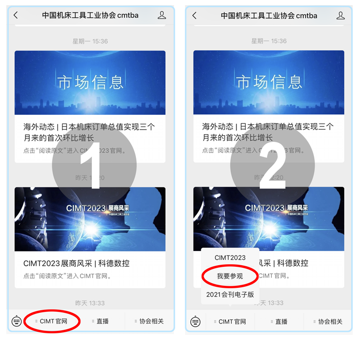 關(guān)注“中國機(jī)床工具工業(yè)協(xié)會(huì)cmtba”微信訂閱號(hào),點(diǎn)擊下方菜單“CIMT2023”中“我要參觀”,填寫相關(guān)信息并提交。其中個(gè)人有效身份證件信息,僅限于境內(nèi)觀眾填寫居民身份證號(hào)。提交成功后,可在展會(huì)現(xiàn)場(chǎng)自助機(jī)打印參觀證。