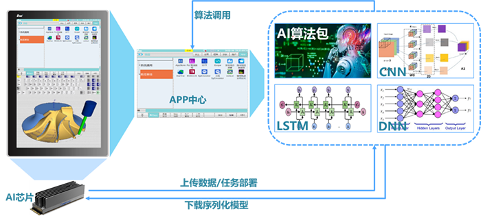 華中9型智能數控系統踐行“智能+”為機床賦能的創新理念,構筑人(H)-機(P)-信息(C)融合的數字孿生系統(S)(HCPS)。該系統深度融合大數據與人工智能技術,打造了“端-邊-云”的智能體系架構,形成了集成AI芯片的智能硬件平臺、支持AI算法的智能軟件平臺、構建智能APP生態的開放平臺。