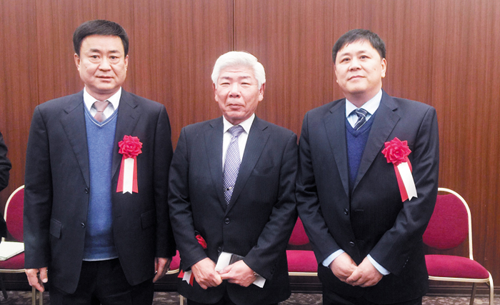 磨料磨具分會會長齊軍亮先生(右一)、磨削砥石工業會會長佐分孝一先生(中)、磨料磨具分會秘書長陳鵬先生合影留念