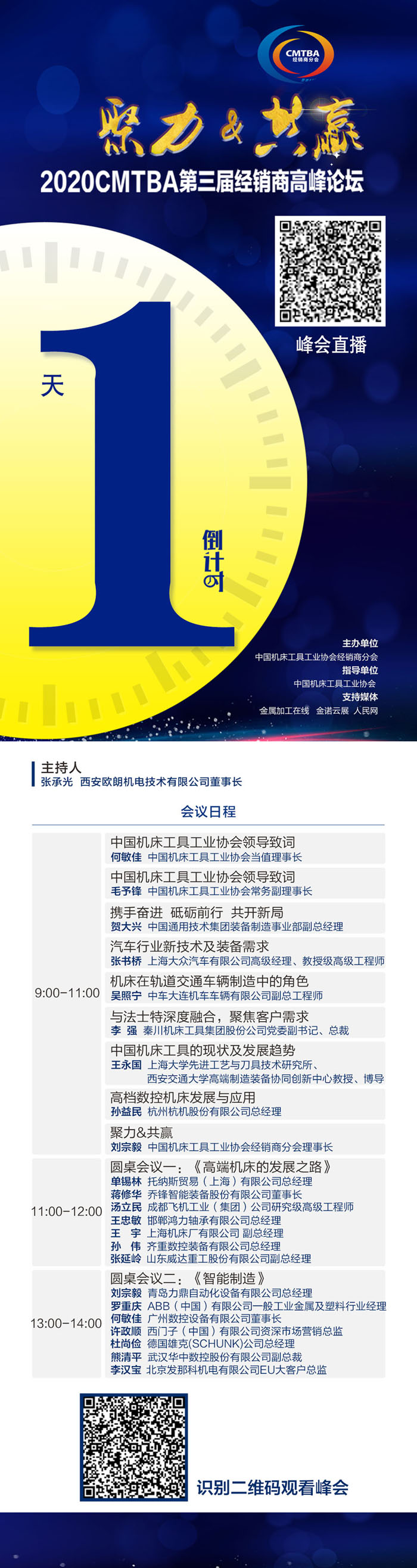 “2020CMTBA第三屆經(jīng)銷商高峰論壇”以“聚力&共贏”為主題,將于2020年12月10日通過云播的方式舉辦。本屆峰會邀請了中國機(jī)床工具工業(yè)協(xié)會總會領(lǐng)導(dǎo)、行業(yè)專家、國內(nèi)外知名制造商、經(jīng)銷商等參加。會議主要圍繞機(jī)床行業(yè)發(fā)展及制造技術(shù),重卡、工程機(jī)械等熱點(diǎn)行業(yè)需求等話題展開,探討經(jīng)銷商群體的轉(zhuǎn)型升級及機(jī)床行業(yè)的發(fā)展趨勢。敬請關(guān)注!